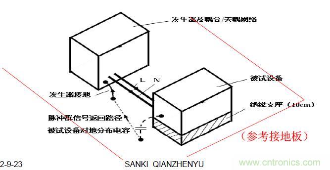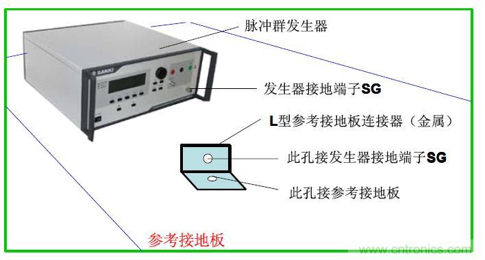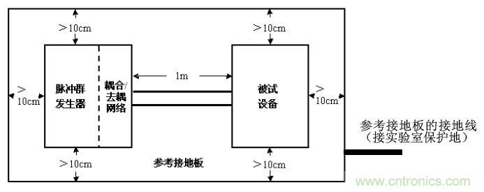 ③ 试验仪器(包括脉冲群发生器和耦合/去耦网络)放在参考接地板上。试验仪器用尽可能粗短的接地电缆与参考接地板连接,并要求在连接处的阻抗尽可能地小。