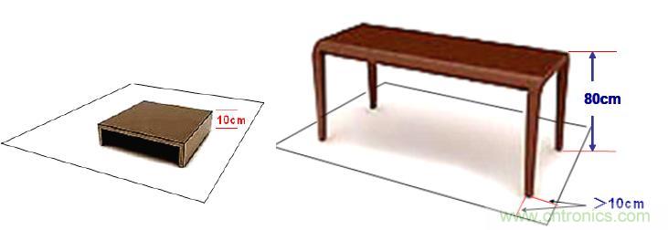 ④ 落地的试品要用0.1±0.01m的绝缘座隔开后放在参考接地板上。对于台式试品,应放置在离参考接地板高度为0.8±0.08m的木头台子上,试品(或试验台子)距参考接地板边缘的最小尺寸满足项①(0.1m)的规定。