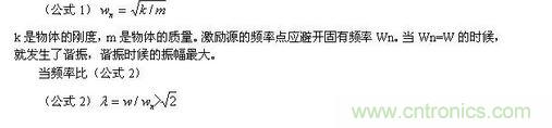 频率可分为固有频率Wn和激励频率W,固有频率源于产品的结构特征,由质量、质量分布、质心位置、刚度等多个因素和多个因素间的相互作用所确定。固有频率计算公式为(公式1)k是物体的刚度,m是物体的质量。激励源的频率点应避开固有频率Wn。当Wn=W的时候,就发生了谐振,谐振时候的振幅最大。
