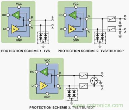 图6所示电路显示了三种不同的完整的EMC兼容解决方案。每个解决方案都经过独立外部EMC兼容性测试公司的认证,各方案使用精选的Bourns外部电路?;?/a>元件,针对ADI公司具有增强ESD?;ば阅艿腁DM3485E 3.3 V RS-485收发器提供不同的成本/?;ぜ侗?。所用的Bourns外部电路?;ぴㄋ蔡缪挂种破?CDSOT23-SM712)、瞬态闭锁单元(TBU-CA065-200-WH)、晶闸管电涌?;て?TISP4240M3BJR-S)和气体放电管(2038-15-SM-RPLF)。