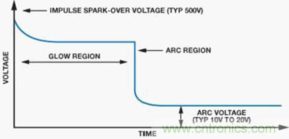 图9显示GDT的典型特性。当GDT两端的电压增大时,放电管中的气体由于产生的电荷开始电离。这称为辉光区。在此区域中,增加的电流将产生雪崩效应,将GDT转换为虚拟短路,允许电流通过器件。在短路事件中,器件两端产生的电压称为弧电压?;怨馇偷缁∏涞淖皇奔渲饕【鲇谄骷奈锢硖匦?。