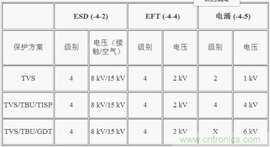 常常需要四级以上的电涌?;?。此保护方案可?;S-485端口免受最高6 kV电涌瞬变的影响。它的工作方式类似于保护解决方案2,但此电路采用气体放电管(GDT)取代TISP来?;BU,进而?;ご渭侗;て骷VS。GDT将针对高于前一种保护机制中所述TISP的过压和过流应力提供?;?。此?;し桨傅腉DT是Bourns公司的2038-15-SM-RPLF。TISP额定电流为220 A,而GDT每个导体的额定电流为5 kA。表3显示此设计提供的?;ぜ侗?。