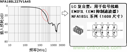 信号频率为12MHz,同去除噪音所必须的频带700MHz相比频率较低,为了接近信号频率通过所必须的频带 (~100MHz) ,选择了插入损耗曲线变化急剧,对信号频率和噪音频率选择度较高的LC复合型EMI滤波器。因为信号线路很多,所以EMI滤波器为排容型NFA18SL系 列。在检查静噪效果和信号质量之间平衡的同时,我们选择了220MHz的截止频率。