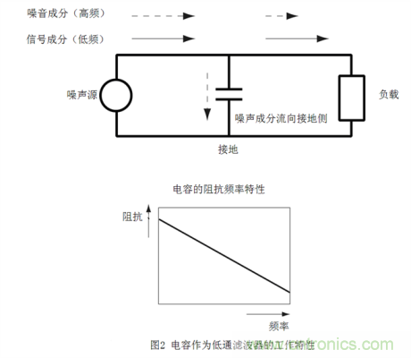低通滤波器如果要利用该特性,就需要将电容插入噪声通道与地线之间。如此一来,低频信号能够照常通过,高频噪声成分因接地侧的阻抗较低,将流向接地侧,从而达到降噪效果。
