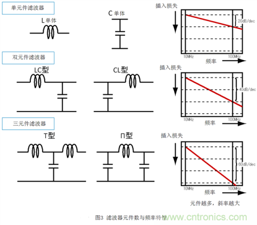 图 3显示了组成滤波器的元件数与滤波器频率特性之间的关系。想知道什么是插入损耗,可以看一下图中各滤波器的信号衰减量,图越往下衰减量越多。从图上我们可 以看到,滤波器中的元件越多,频率特性的斜率就越大。元件较少的滤波器的频率特性范围较窄(斜率较?。ゼ跗德始巴ü德实难≡穸冉系?,有可能导致部分 信号衰减或者噪声没有彻底去除。另一方面,元件较多的滤波器的频率特性范围较宽(斜率较大),频率的选择度较高,信号可以在几乎不衰减的状态下去除噪声。