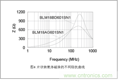 一般来说,片状铁氧体磁珠是以100MHz的阻抗值来决定其规格的。但与此同时, 也存在着诸多拥有相同阻抗值的不同产品,这是因为它们的曲线形状各不相同。图4所示的就是其中一例。BLM18AG601SN1与 BLM18BD601SN1都是100MHz阻抗值为600Ω的片状铁氧体磁珠,但从它们的阻抗波形可以看出,与BLM18AG601SN1较为平稳上升 的曲线相比,BLM18BD601SN1的曲线则呈急速上升的趋势。