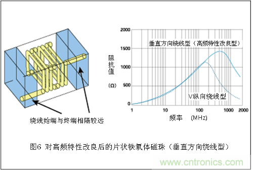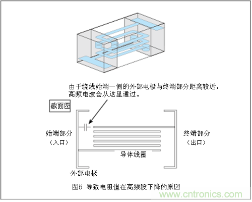 通过前记图3中介绍的片状铁氧体磁珠阻抗频率特性可以看出,阻抗值以 400-500MHz范围为界开始减少。这是由于片状磁珠的结构所带来的影响。一般来说,电感器的阻抗会随着频率的上升而逐步增大。然而,如图5所示,普 通的片状铁氧体磁珠内部在绕线始端(入口)和终端(出口)附近会存在相互较为接近的部位。由于这个部分会发生静电耦合(存在一个微型电容的状态),高频电 流通过这里时会出现不容易受电感器阻抗影响的情况。由于频率越高,静电耦合部分越容易通过,因此频率越高所显示的阻抗也就越低。