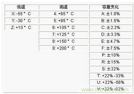 按极性分为:有极性电容和无极性电容。无极性电容(主要指陶瓷电容)的参数(电介质材料类别,温度特性以及误差等参数)选择在一些设计中是比较关键的。表1为电容的温度与容量误差编码表。如X7R电容表示电容工作的温度范围是-55-125℃,容量变化范围是±15%。