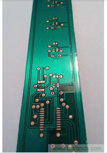 用铆钉也存在一些严重的问题。我做的许多过孔结果都呈开路状态。我很肯定的是,这是由于铜的腐蚀性质造成的。因为在做阻焊层那一步铜焊盘都放在碳酸钠溶液中,并且随后经过了层压机和炉子的高温,因此被氧化就不奇怪了。另外,将一种金属折叠到另一种金属上似乎是一种很差的电气连接方法。我最后在铆钉周围加了少量的助焊剂,并进行了回流焊。经过这样的处理后所有过孔都没问题了,最可能的原因是助焊剂中的焊剂清除掉了氧化物。