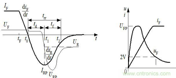 在开关电源中常使用工频整流二极管、高频整流二极管、续流二极管等,由于这些二极管都工作在开关状态,如图所示,在二极管由阻断状态到导通工作过程中,将产生一个很高的电压尖峰VFP;在二极管由导通状态到阻断工作过程中,存在一个反向恢复时间trr,在反向恢复过程中,由于二极管封装电感及引线电感的存在,将产生一个反向电压尖峰VRP,由于少子的存储与复合效应,会产生瞬变的反向恢复电流IRP,这种快速的电流、电压突变是电磁干扰产生的根源。