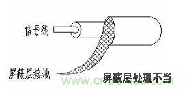 双绞线、同轴电缆都能有效的抑制电磁干扰。在脉冲信号传输线路中常使用双绞线,控制辅助电源线和传感器信号线最好用双绞屏蔽线。因为双绞线两根线之间有很小的回路面积,而且双绞线的每两个相邻的回路上感应出的电流具有大小相等、方向相反,产生的磁场相互抵消,这样就可以减小因辐射引起的差模干扰,不过双绞线绞合的圈数最好为偶数,且每单位波长所绞合的圈数愈多,消除耦合的效果愈好。使用时注意双绞线和同轴电缆两端不能同时接地,只能单端接地,而对屏蔽线,屏蔽层两端接地能既能屏蔽电场还能屏蔽磁场,单端接地只能屏蔽电场。使用同轴电缆时还要注意,其屏蔽层必须完全包覆信号线接地,即接头与电缆屏蔽层必须3600搭接,才能有效屏蔽电磁场,如图4所示,信号线裸露部分仍可以与外界形成互容耦合,降低屏蔽效能。