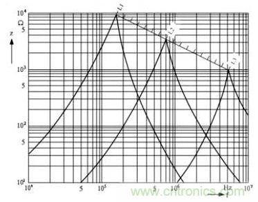由图中可以看出,电感线圈的阻抗开始的时候是随着频率升高而增大的,但当它的阻抗增大到最大值以后,阻抗反而随着 频率升高而迅速下降,这是因为并联分布电容的作用。当阻抗增到最大值的地方,就是电感线圈的分布电容与等效电感产生并联谐振的地方。图中,L1 > L2 > L3,由此可知电感线圈的电感量越大,其谐振频率就越低。从图2中可以看出,如果要对频率为1MHZ的干扰信号进行抑制,选用L1倒不如选用L3,因为 L3的电感量要比L1小十几倍,因此L3的成本也要比L1低很多。