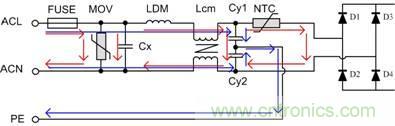对ACL与ACN之间施加的浪涌电压称为差模浪涌电压,差模路径如图中红线所示;对ACL(或ACN)与PE之间施加的电压称为共模浪涌电压,共模路径如图中蓝线所示。