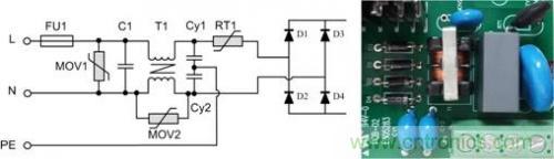背景:以某型号的电源模块为例,该??槭侵芰⒐χ略兜缱游晨突Фㄖ频牡缭茨??,输入85VAC~350VAC,且EMC前级电路电路嵌入到模块中。抗浪涌要求差模电压3KV,共模电压6KV。更换更大的保险丝后可承受6KV差模电压。其前级原理图及对应实物图如图2所示