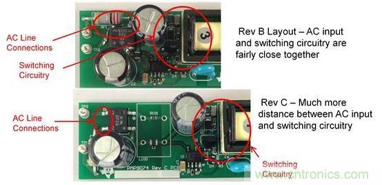 2.查看电源中的寄生电容。我们都记得物理课上讲过,两个导体之间的电容与导体表面积成正比,与二者之间的距离成反比。查看电路中的每个节点,并特别注意具有高 dV/dt 的节点。想想电路布局中该节点的表面积是多少,节点距离电路板输入线路有多远???MOSFET 的漏极和缓冲电路是常见的罪魁祸首。