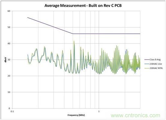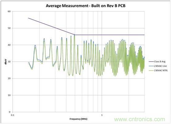我通过简单调整电路板(无电路变化),将噪声降低了大约 6dB。见图 2 和图 3 的测量结果。在有些情况下,接近高 dV/dt 进行输入线路布线甚至还可击坏共模线圈 (CMC)。