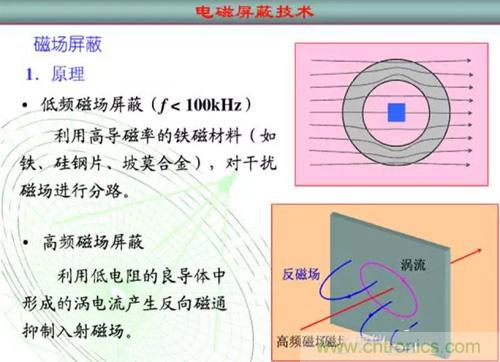 高电导率材料制成的屏蔽物对低频磁场的屏蔽效果比较差。例如,在工频50赫时,铜的贯穿深度约为9.4毫米,薄壁铜壳的屏蔽作用很小。在实际应用中,常采用静磁屏蔽措施来屏蔽低频磁场。电磁屏蔽物接地后也可以屏蔽静电干扰。电磁屏蔽物上不能随意开缝,因为电磁屏蔽还利用了涡电流的作用,若缝隙割断了涡电流的通路,屏蔽效果要降低。