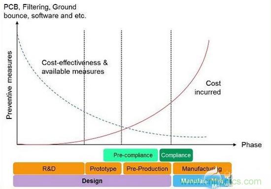 图1:当产品在开发阶段一步步推进时,变更所承担的潜在成本上升,清除EMI问题的可用措施逐步受到限制。