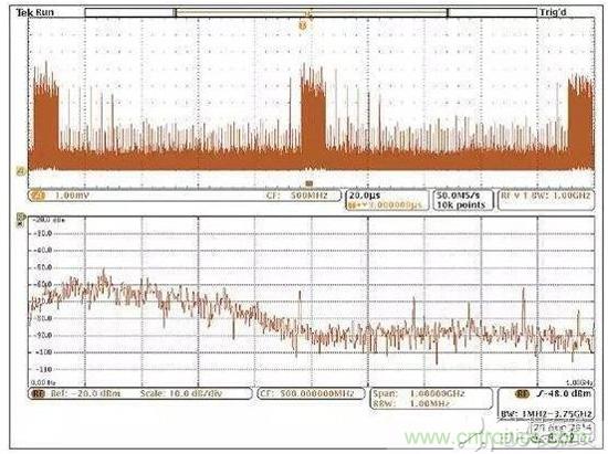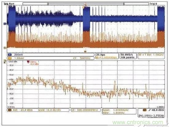 然而,混合域示波器(MDO)的推出使情况有了改观,它能提供同步的而且与时间相关联的观察和测量功能。如图5所示的这种仪器能够相当容易地让我们观察哪个信号与哪个EMI事件同时发生,从而可以简化EMI排查过程。