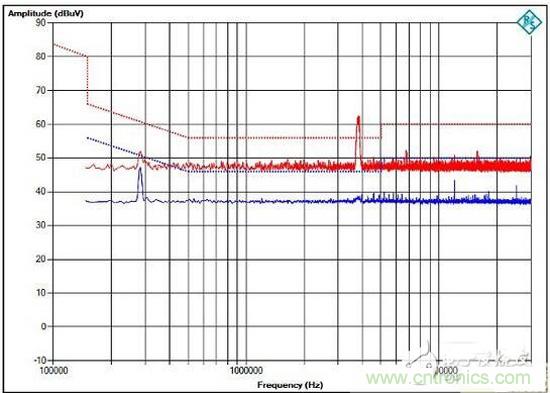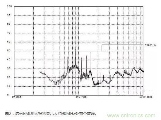 请看图2所示的EMI测试报告,这份报告显示大约90MHz处有个故障。