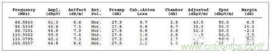 在图3所示的余量栏中,你可以看到有一个峰值超出了这个规范标准在88.7291MHz处规定的极限,与规范相差-2.3。