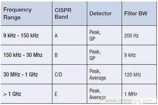 表1:CISPR测试要求根据不同频率范围而有所变化,并影响频率分辨率。