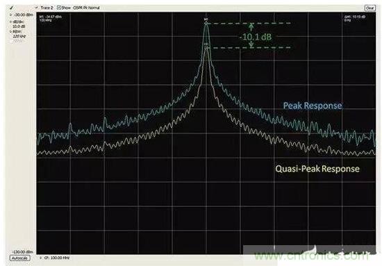 好消息是,峰值和准峰值扫描对预先一致性测试来说仍然是有用的。图4给出了一个峰值和准峰值检测的例子。图中显示了峰值检测和准峰值检测中都能看到的脉宽为8μs、重复率为10ms的信号。结果准峰值的检测结果比峰值低了10.1dB。
