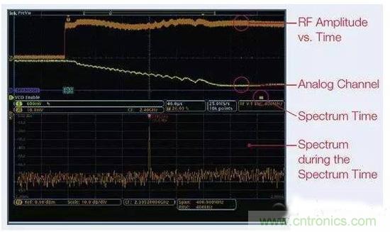 图6:这张图显示了MDO提供的时间关联观察功能,图中显示了射频幅度与时间的关系轨迹。