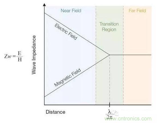 图7:这张图显示了近场和远场中的波阻行为以及两者之间的过渡区。近场测量可用于EMI排查。