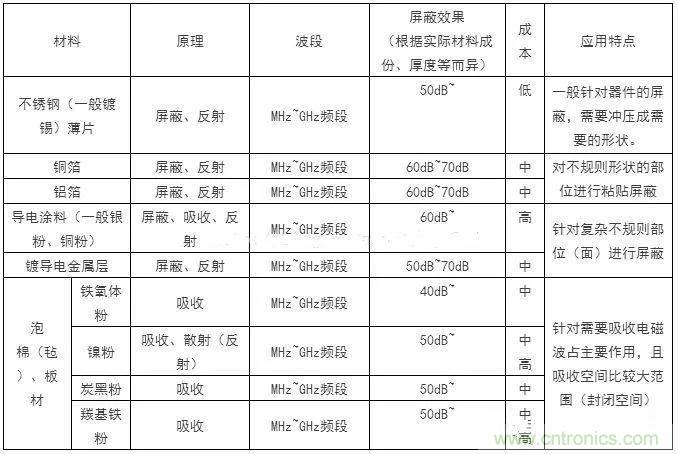 不锈钢、铜箔、铝箔、导电涂料、电磁波吸收材料(铁氧体、镍粉、碳黑、羰基铁等)。