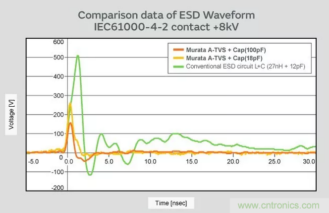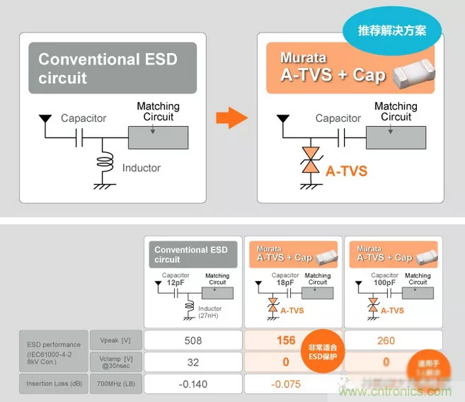 A-TVS和电容器组合,比较电感器和电容器组合的ESD?;ば阅堋-TVS和电容器的组合可更有效地抑制ESD。