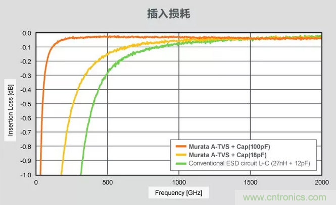 可见低频带的A-TVS的插入损耗,比电感器和电容器的组合更低。