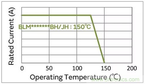 2) 通过保证150℃的片状铁氧体磁珠的额定电流降额