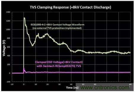 TVS Clamping Response ( 8kV Contact Discharge): TVS钳位响应( 8kV接触放电)8kV Contact voltage waveform: 8kV接触电压波形No external TVS protection implemented: 没有使用外部TVS?;lamped ESD voltage( 8kV contact) with Semtech RClamp0531TQ TVS: 使用Semtech RClamp0531TQ TVS的钳位ESD电压( 8kV接触电压)Time: 时间
