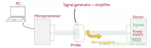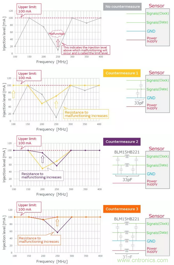 传感器的信号线收到噪声影响,传感器的通信会发生停止。提高注入的噪声水平,调查能够正常工作(不发生误操作)的水平极限。