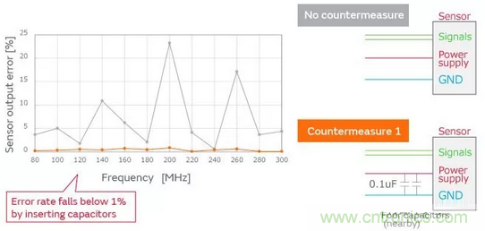 传感器的电源线受噪声影响,会发生传感器输出值的异常(输出误差)。将注入电源线的噪声级固定,对对策前后的输出误差的大小进行调查。