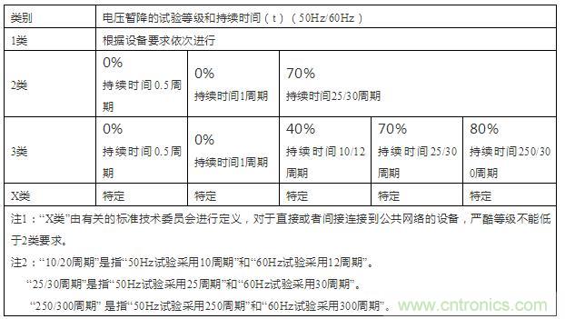 表1:电压暂降试验优先采用的试验等级和持续时间