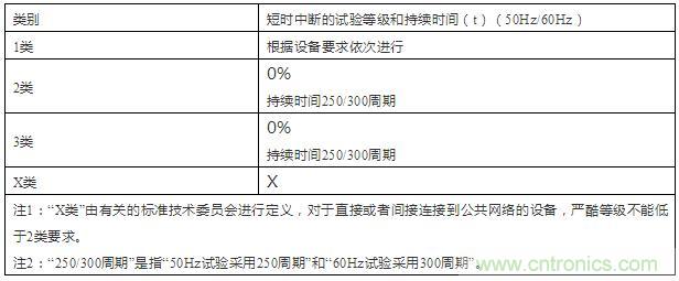 表2:短时中断试验优先采用的试验等级和持续时间