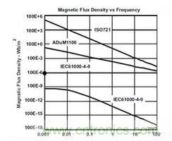 下图比较了ADI的ADuM1100(磁隔离)和TI 的ISO72x(电容式隔离)的磁场抗扰度,虽然两个例子在限定磁场下都不太受磁场影响,但ISO72x对磁场抗扰度有更好的表现。