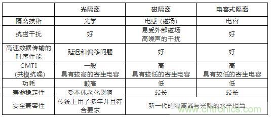 无论是光隔离、磁隔离或是电容式隔离,只要在适当的条件下工作都可以达到很出色的隔离效果。下图是一个三种隔离技术的简单比较: