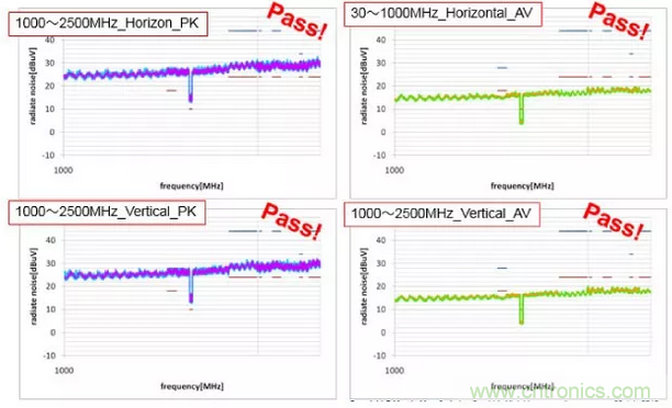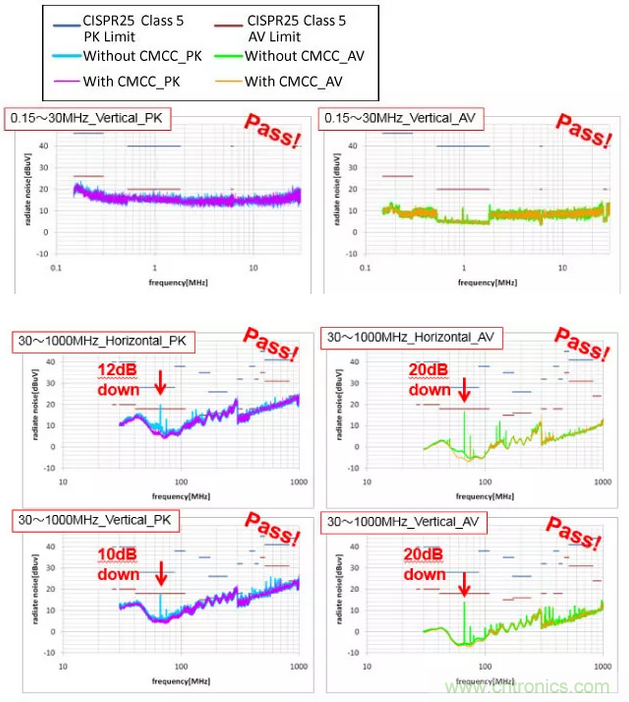 使用支持100Base-T1的共模扼流圈‘DLW43MH201XK2’,辐射噪声便能符合CISPR25 Class5。