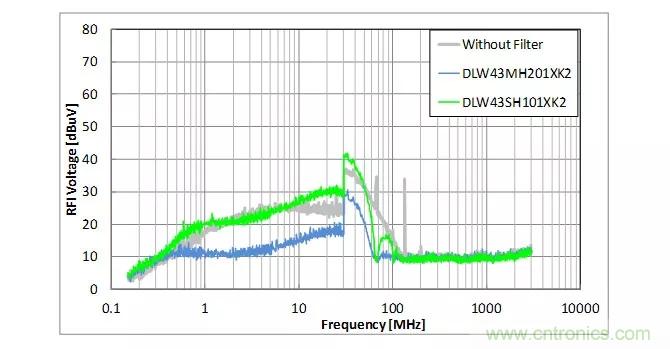 支持CAN、FlexRay的DLW43SH101XK2在有些频率下噪声会增加,降噪效果不佳,但使用支持100Base-T1的DLW43MH201XK2能有效地降噪。