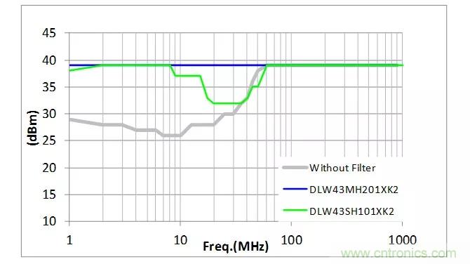 【导读】支持CAN、FlexRay的DLW43SH101XK2在有些频率下噪声会增加,降噪效果不佳,但使用支持100Base-T1的DLW43MH201XK2能有效地降噪。