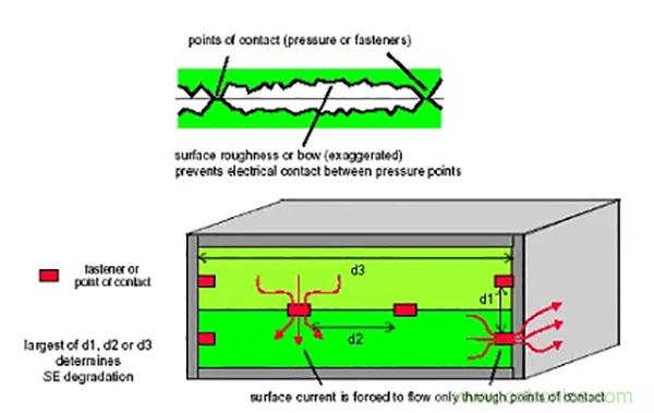 d、屏蔽体的电连续性是影响结构件屏蔽效能最主要的因素,相对而言,一般材料本身屏蔽性能以及材料厚度的影响是微不足道的(低频磁场例外);