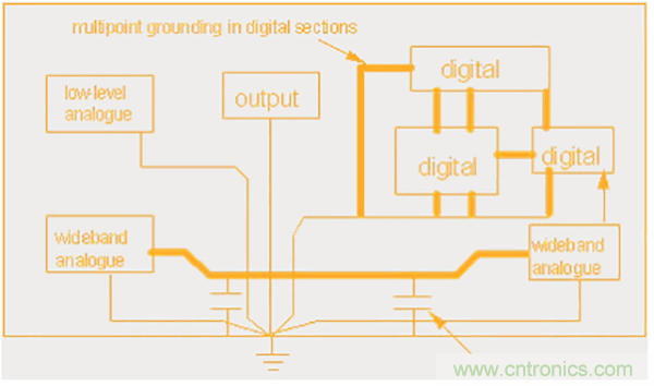 b、数字电路与模拟电路、高速电路与低速电路、干扰源与敏感电路分开布局