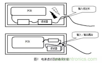 主要考虑(1)抑制工作频带以外的干扰;(2)在信号电路中用吸收滤波器消除无用的频谱成分;(3)在电源电路(尤其是开关电源中),操纵电路,控制电路,以及转换电路中消除产生的干扰。在工程实际中,一个最值得注意的地方是电源滤波器的安装,常见的滤波器的错误安装如图2所示。