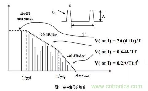在EMC中,除了基本频率外,还需考虑谐波因素,通常取十倍频,但在数字电路中却有些不同,比如在时钟电路和逻辑门电路中,辐射带宽与数字信号的上升沿或下降沿有关系,而不是数字信号的重复周期,其关系为:rtF?/1max?,其中rt是脉冲的上升沿时间。例如,典型时钟驱动的边沿速率是2ns,此时,maxF≈160MHz,再考虑十倍频,则此时钟电路可能产生直到1.6GHz的辐射带宽。所以在选择器件时要选择慢速的逻辑器件系列,因为器件对电磁辐射贡献的大小与工作频率无直接关系而只取决于边沿速率(这和从电路功能设计上选择快速器件是矛盾的,在电路设计时需要折中考虑)?;褂写悠骷目谷拍芰ι侠此担珻MOS器件是最好的,因为它的噪声容限高。从封装上来说,BGA是最好的,因为它的引线很短。脉冲信号的频谱如图3所示。