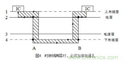 在布线时尽量少穿过孔,因为过孔阻抗和线阻抗不一样,存在阻抗突变,从而产生驻波使信号变坏,容易形成辐射,尤其是在时钟需要穿层时,要做技术处理,时钟线跨层时的处理如图6所示。