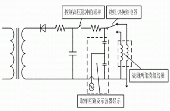目前市面上有不少专用的绕组匝间冲击耐电压测试仪,这类匝间冲击耐电压测试仪产品的基本原理都是以同型号绕组感抗相等为前提,采用波形比较法,以高压脉冲对等效过电压、无损模拟试验。然后通过示波器这样的装置通过完全一致的取样回路来测量这个脉冲在绕组线圈中的振荡波形,如果两个波形不一致,那么表明这两组线圈中至少有一组存在匝间短路的故障。其测量原理图如下: