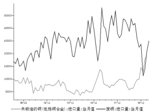 我国铜分月进口量(吨) 数据来源:Wind资讯